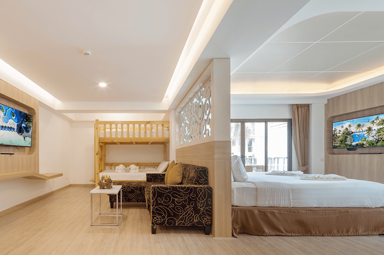 Located on the second and third floors, Family Suites combines the very best views of garden and sea. Our 2 exclusive suites are specially designed to cater to the holiday needs of parents traveling with their children. With a vast area of 65 sqm, parents can enjoy their comfortable and private bedroom while the kids snooze in their lofty bunk bed. Ample living space with a dining area and bathroom featuring both shower stand and a sizable bathtub. Enjoy quiet family time in your room while taking in the magnificent views of the gardens and oceanfront from the spacious balcony. Truly an unforgettable stay for the entire family.