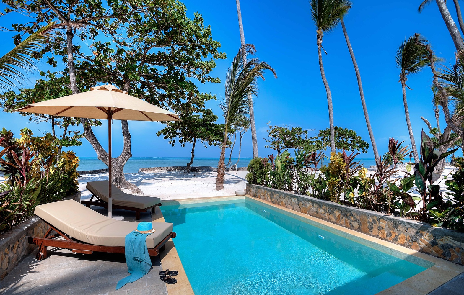 Beach Front Suite with Pool is designed in refined Swahili style, blending natural materials with warm colors that reflect the spirit of the island. The spacious bedroom features private pool, a king-size or twin beds draped in mosquito nets for a restful sleep, while the large windows fill the room with natural sunlight and refreshing sea breeze.