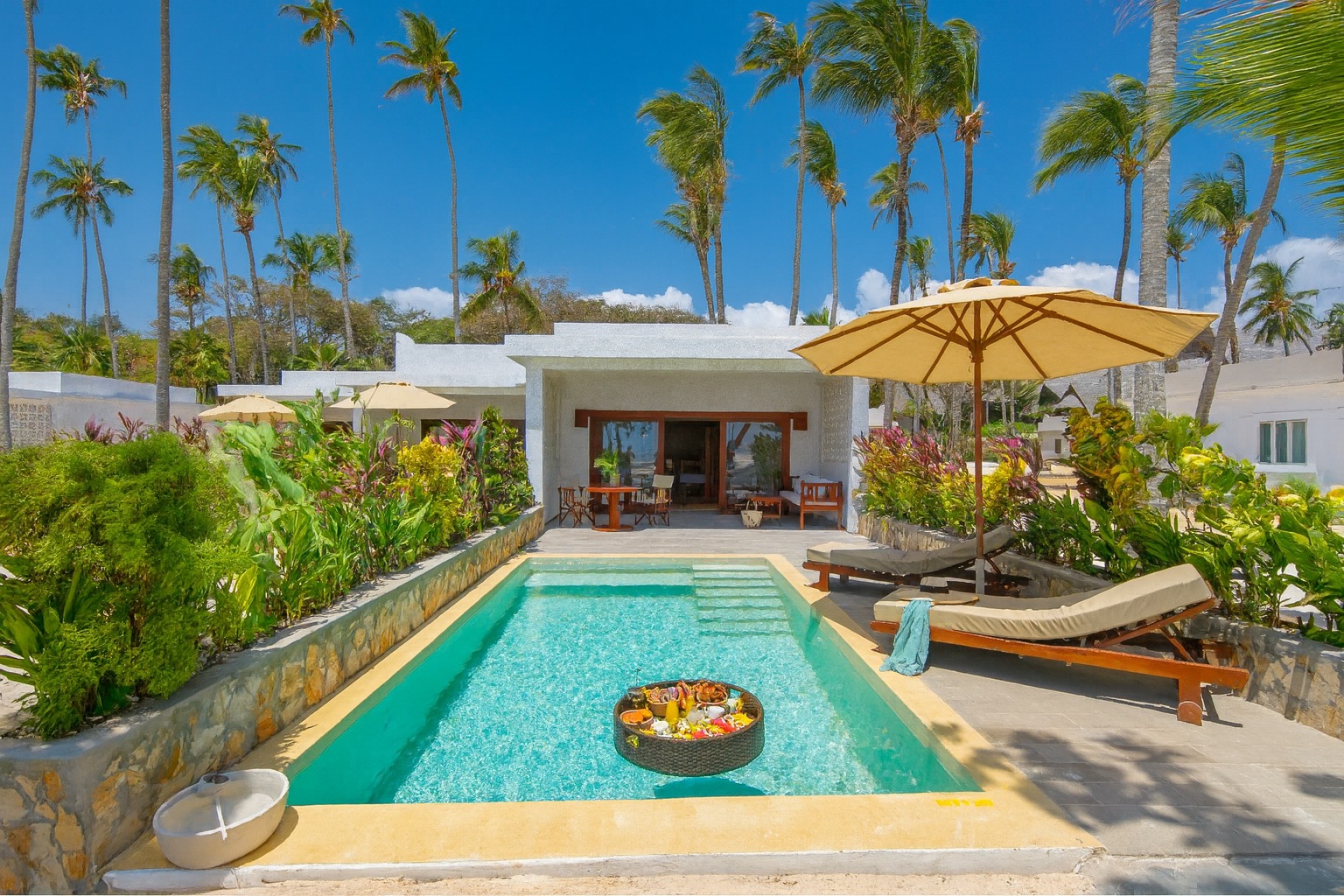 Sea Front Beach Villa with Pool is thoughtfully designed with Swahili-inspired architecture and natural materials that blend seamlessly with the surrounding landscape. Inside, a spacious bedroom features a king-size draped in a mosquito net, private pool, and complemented by large windows that let in warm tropical light and ocean breeze.