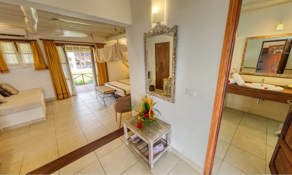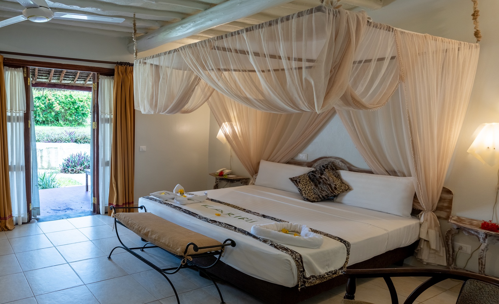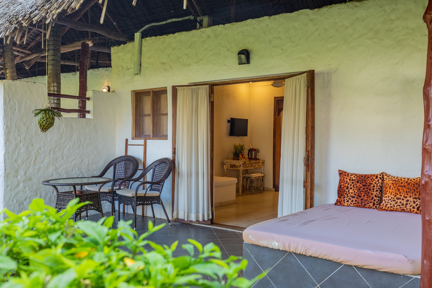 Positioned at the top of the slope in the lush tropical gardens. Some are close to the Masai pool Village, and the others are near the Bondeni pool area. They are comprised of: bedroom, wardrobe, bathroom, garden view veranda with 2 chaises-longue and table