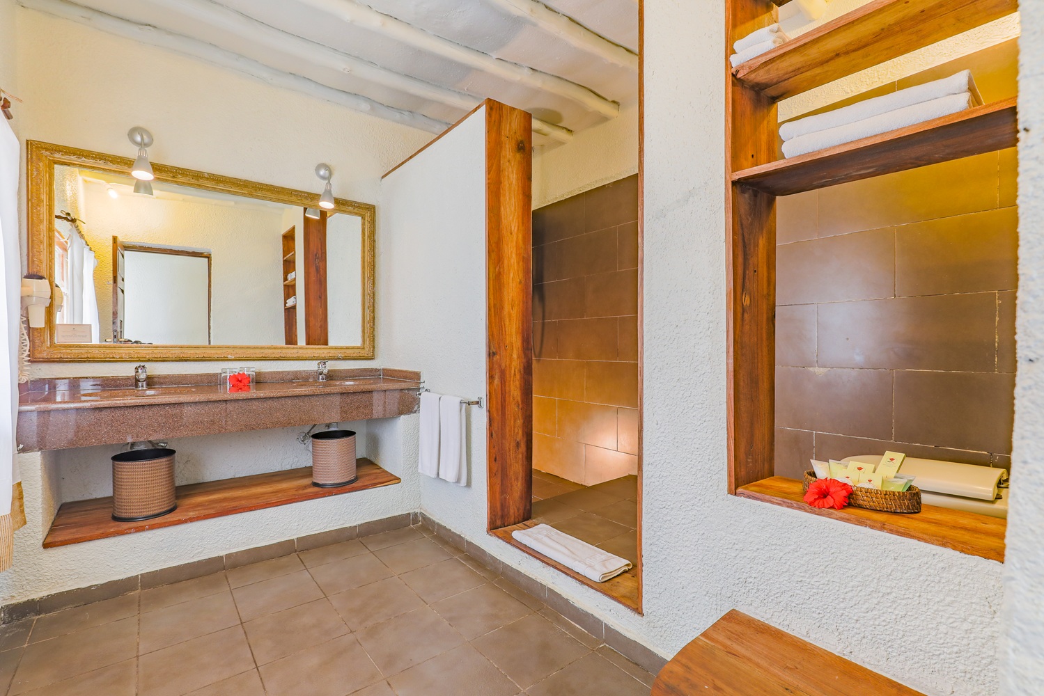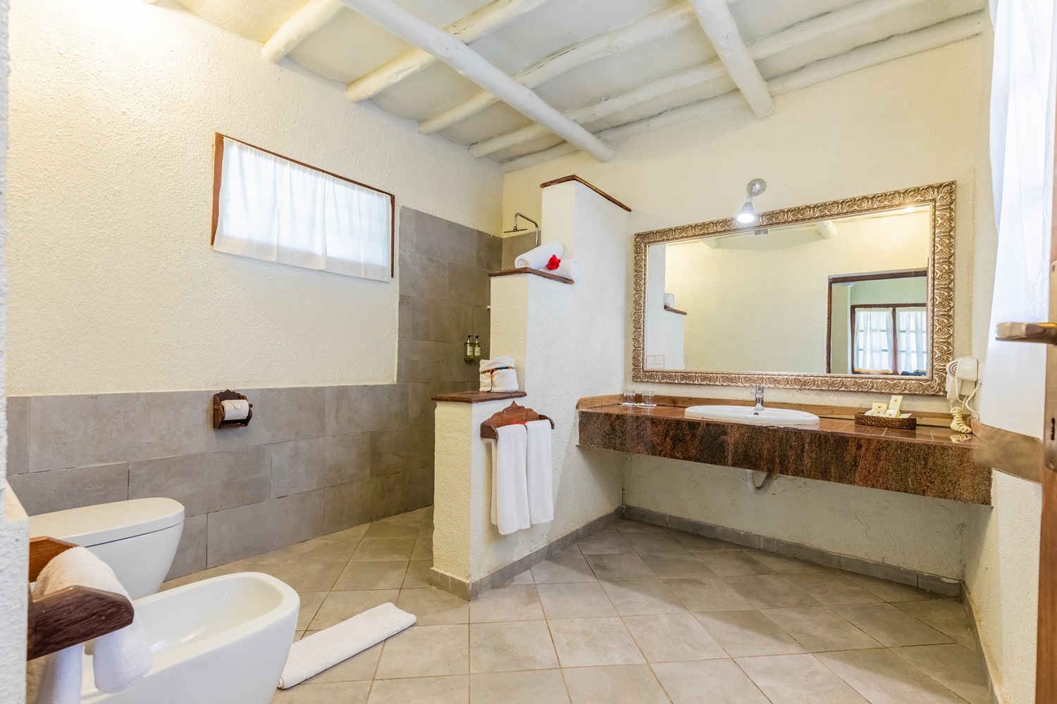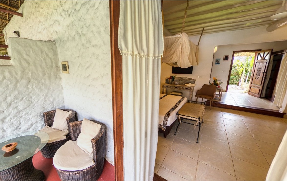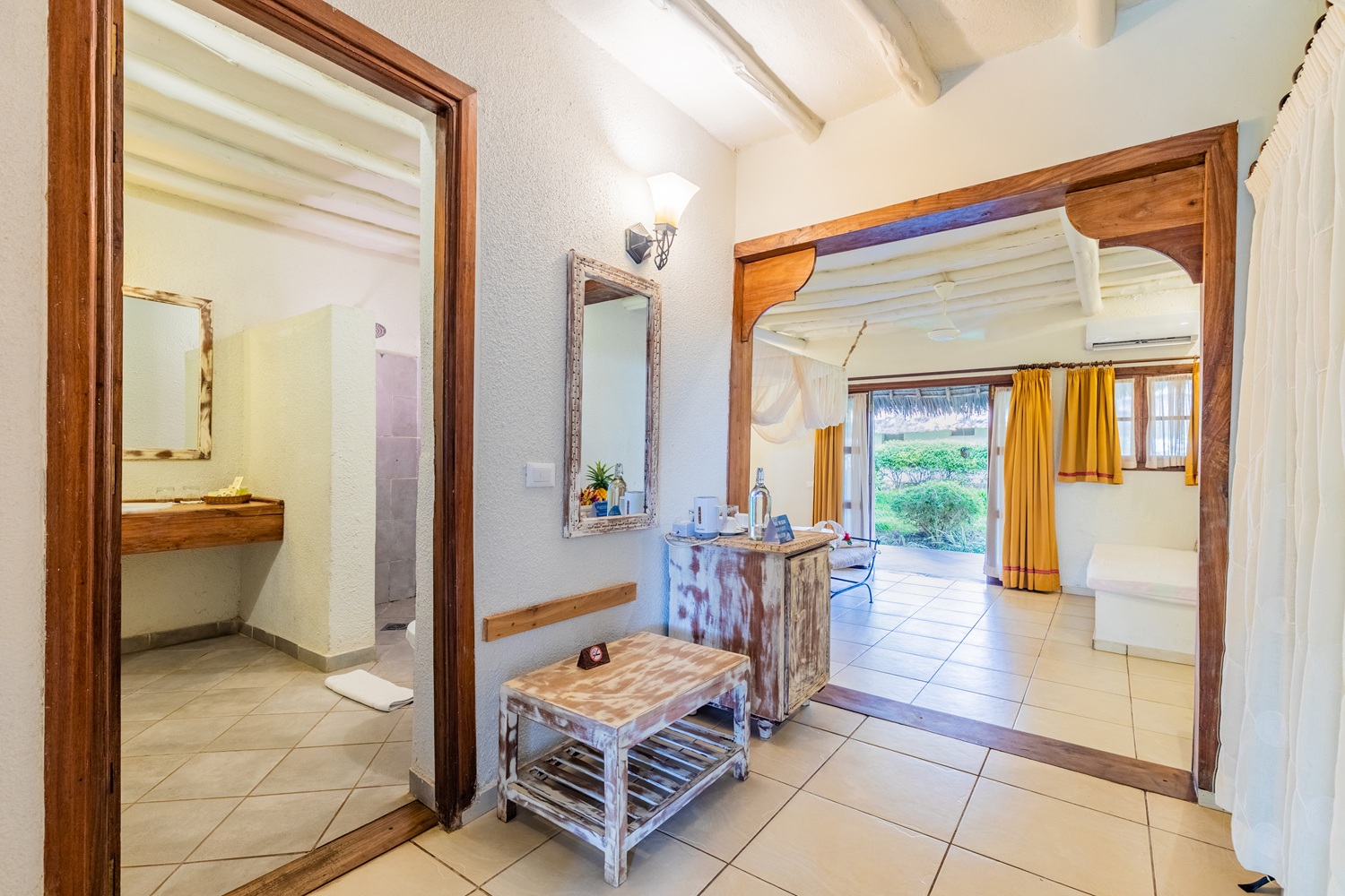 Positioned at the top of the slope in the lush tropical gardens. Some are close to the Masai pool Village, and the others are near the Bondeni pool area. They are comprised of: bedroom, wardrobe, bathroom, garden view veranda with 2 chaises-longue and table