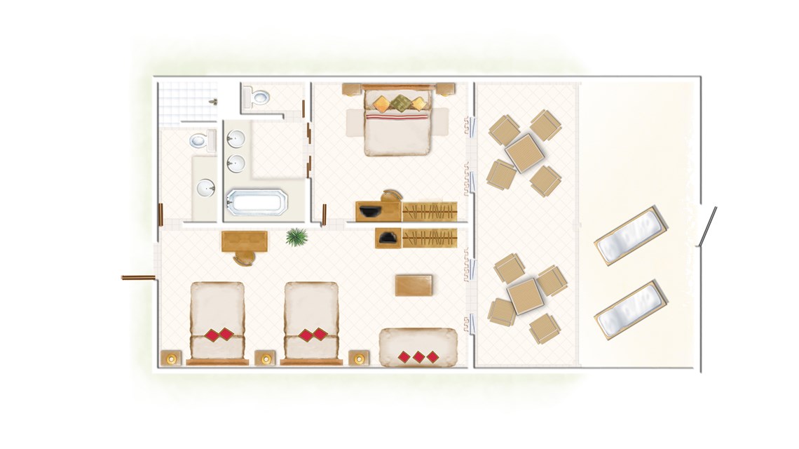 Superior rooms can accommodate up to 2 adults, one child and an infant of up to 24 months with a living space of 38 square meters. These ground floor rooms have a small courtyard. Bathrooms have a bath, shower, double basins, and a toilet.