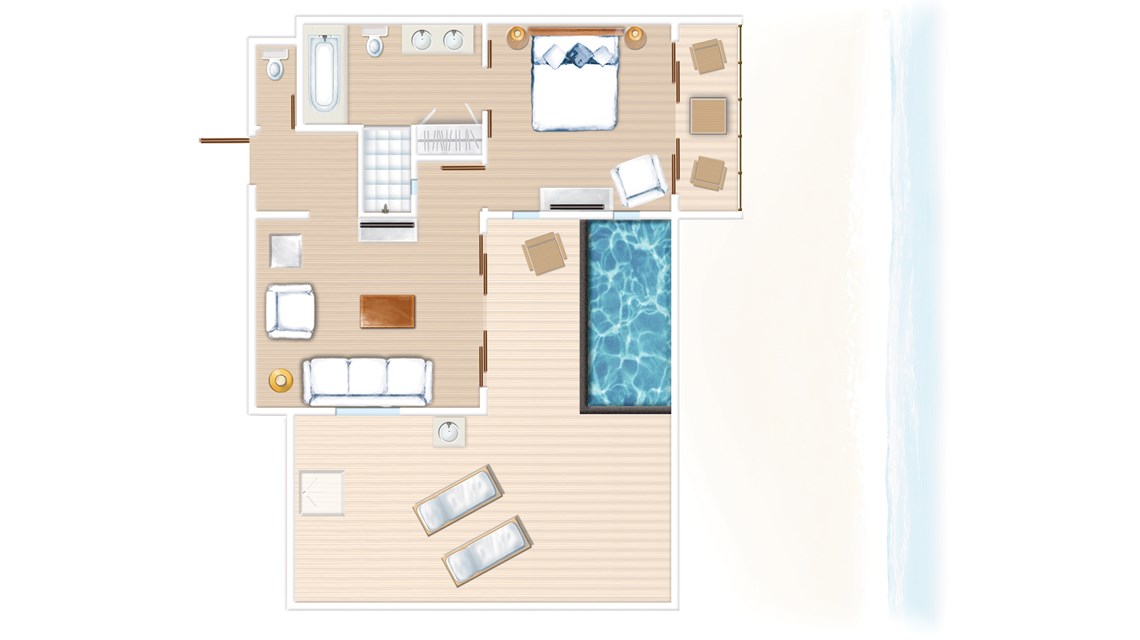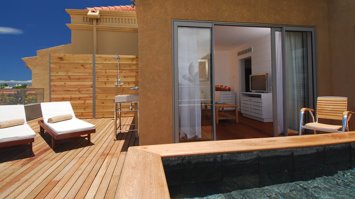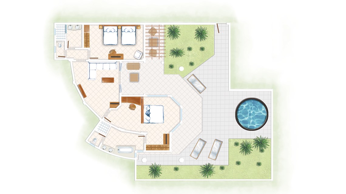Suites can accommodate up to 2 adults with a living space of 75 square meters. All suites are on the top floor and offers one bedroom with bathroom featuring bath, shower and separate toilet lounge, coffee machine, terrace with outdoor shower and private pool.