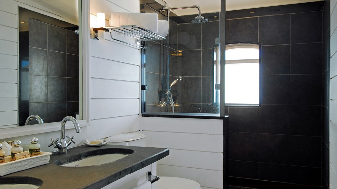 Tropical green interiors blend perfectly with cool touches of beige and white. Each room has a shower, basin, and toilet, and all rooms are situated on the first or second floor.