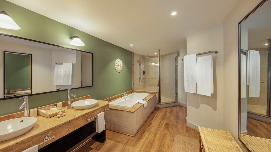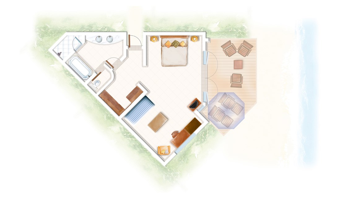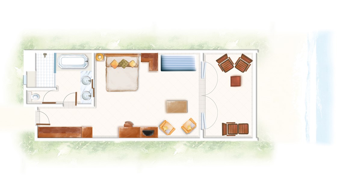 The Deluxe Rooms are located on either the Ground or 2nd Floor (Sea Facing). Each room has a ceiling fan as well as air conditioning with a large bathroom with bath and separate shower. Ground floor rooms extend onto a lovely lounge area and terrace where guests will enjoy the beautiful view of the lush tropical gardens.