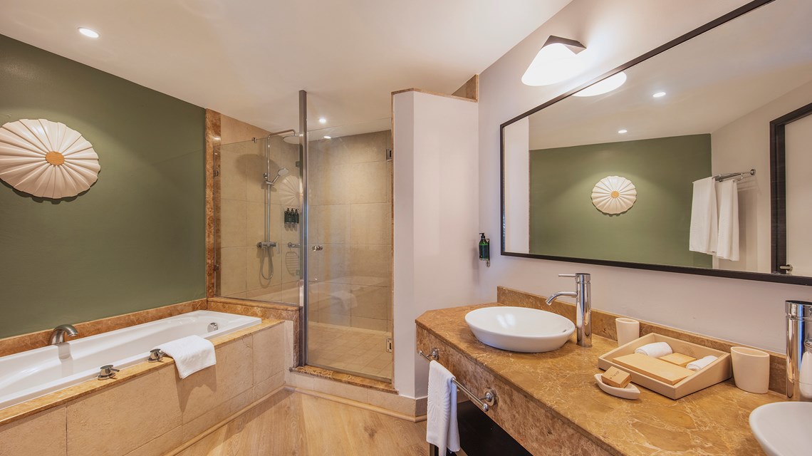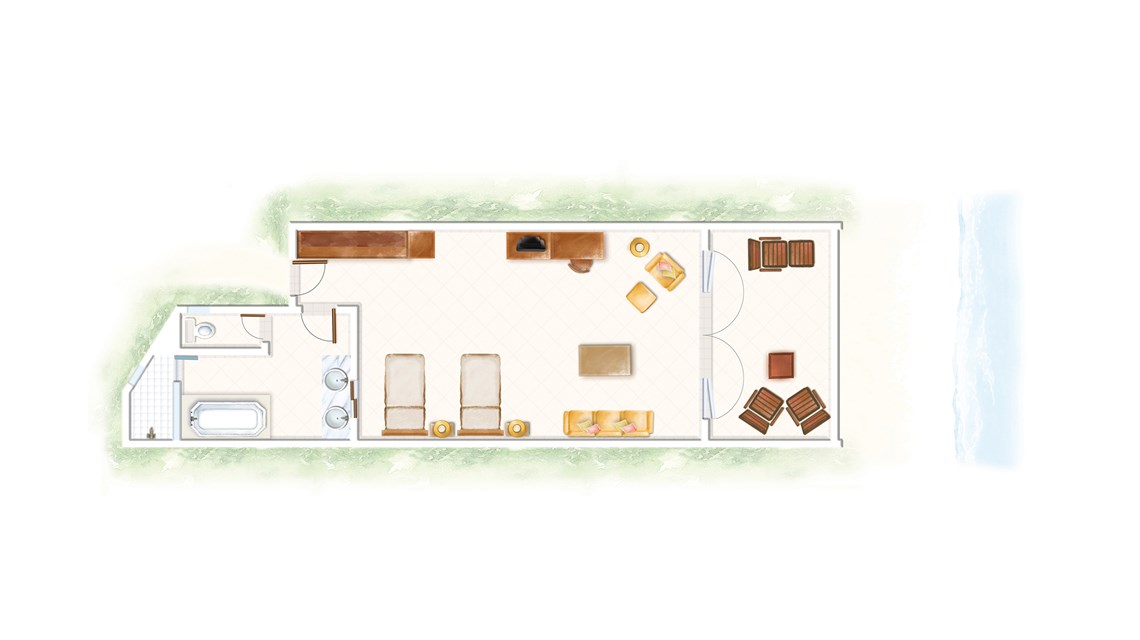 These rooms open directly onto a generous 800sqm pool with sun loungers in the pool. The interior living areas are specious and cosy. It features an outdoor terrace, bathroom with bathtub, shower and separate toilet